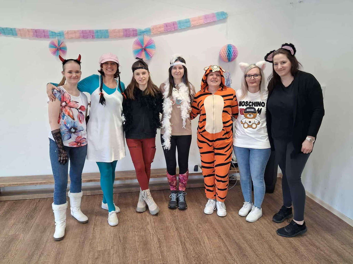 Děkujeme všem rodičům za nápadité kostýmy a organizátorům za zábavný program (na fotografii zleva: „čertice“ Radka Kovařčíková, „šmoulinka“ Terezie Kachlová, dvě slečny s fascinátory a boa Radka Kovařčíková a Markéta Segeťová, „tygřice“ Renáta Pantůčková a dvě „pandice“ Martina Švrčková a Jana Křížková) – Podle úsměvů na tvářích dětí, které můžete vidět v naší fotogalerii, se letošní maškarní bál skutečně povedl!