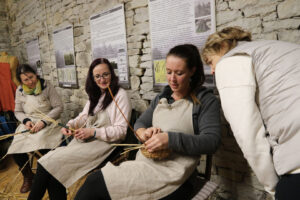První skupina zůstala v teple sklepení a pod vedením paní domácí se pustila do spirálového vázání ošatek z žitné slámy a vrbových loubků. Práce šla děvčatům od ruky (pánové se k této jemné technice raději neodvážili) a do oběda si každá účastnice odnášela hotový výrobek. Čas krátil i poutavý výklad o dnes již zaniklých řemeslech.