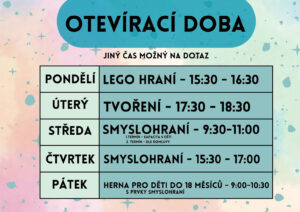 Věnujeme se přípravě akcí v rámci naší obce. Nebo pořádáme víkendové hraní karetních her jako je Pokémon a Lorcana. Naši herničku můžete navštívit i se školkou, dětskou skupinou nebo partou přátel a pokud je vás hodně, rádi přijedeme s našim hraním k vám. S příchodem teplého počasí si děti mohou užít stanoviště smyslohraní venku – zejména vodní a matlací a spojit hraní s pobytem na čerstvém vzduchu, zatímco si rodiče popovídají.