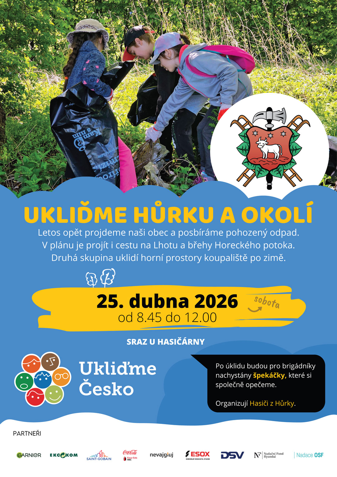 Ukliďme Hůrku a okolí. Letos opět projdeme naši obec a posbíráme pohozený odpad. V plánu je projít i cestu na Lhotu a břehy Horeckého potoka. Druhá skupina uklidí horní prostory koupaliště po zimě.